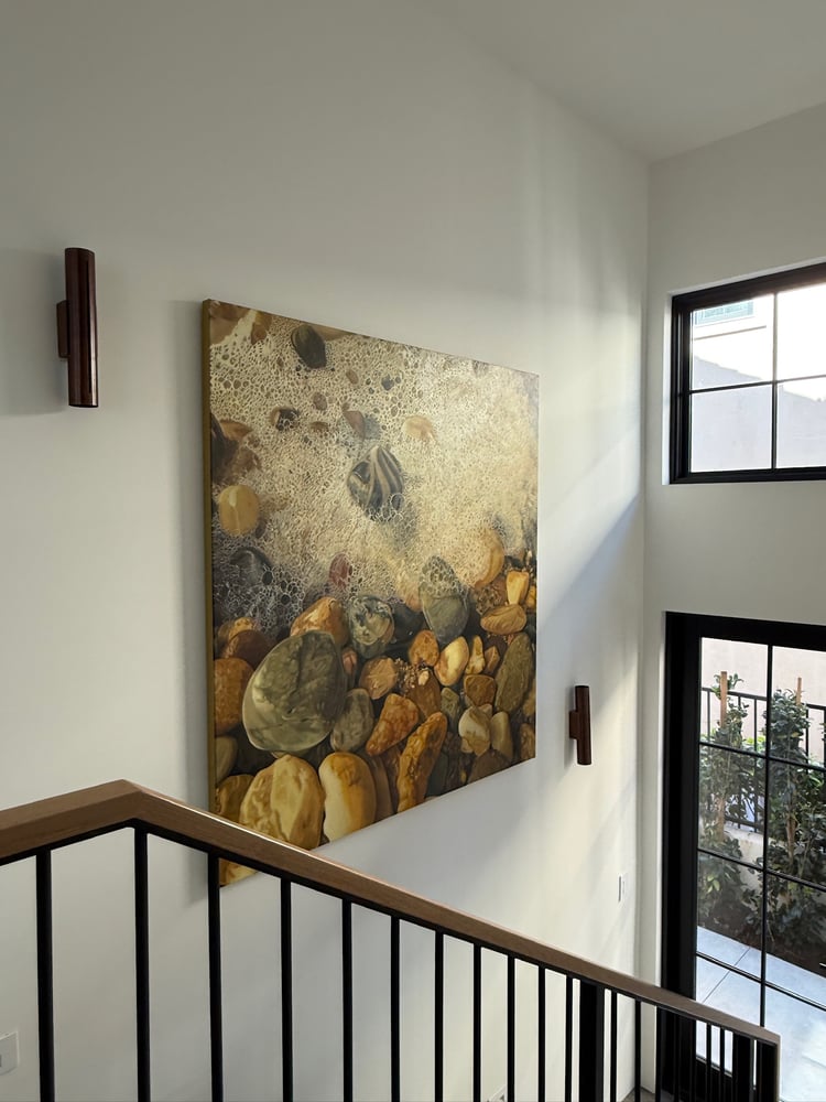 The drop of water that breaks the rock flows and shapes, with its dizzying rhythm, what was once fire and transformed into stone. This constancy through time molds treasures, which, when captured on a canvas under the magnifying glass of colors, each work is perceived or transformed into crystals, ice, or fire before the viewer's eyes.